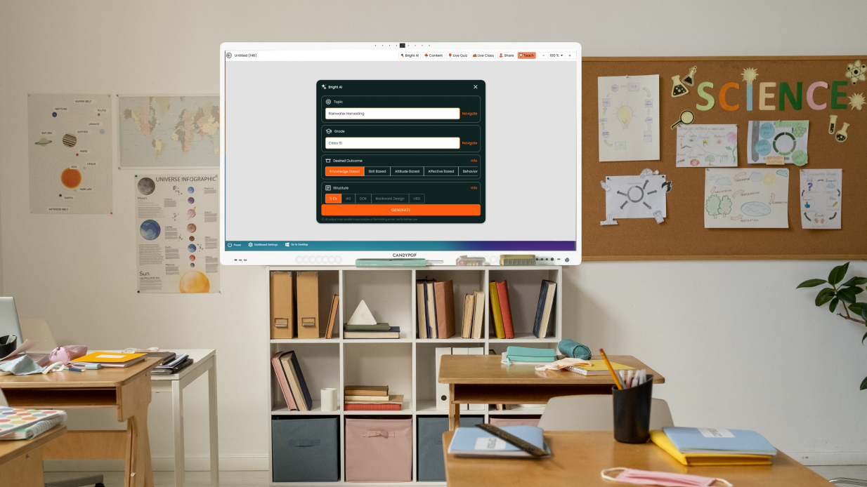 Candypop IFP 4K resolution display is embedded with powerful and crisp sound speakers. Supports dual operating system - Latest Android and Windows OS. Efficient smart Interactive display equipped with built-in WiFi module, multiple signal interfaces. Design engaging and meaningful lessons in few minutes using AI.